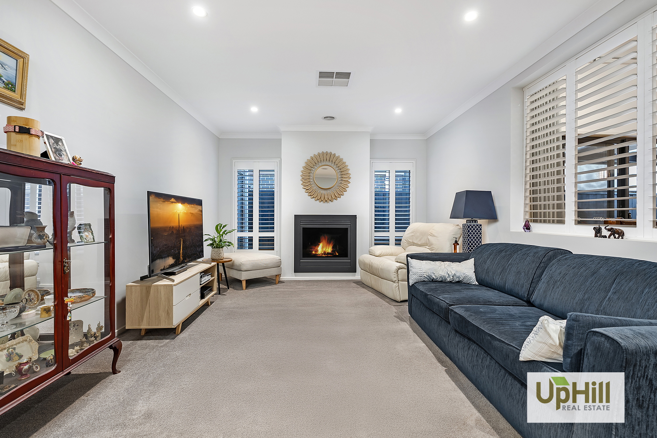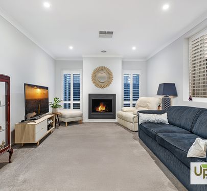 The dedicated rumpus, or theatre room to back of the house offers an inviting space to unwind or entertain, and dedicated front lounge completes with a charming gas log fireplace a striking feature wall with plantation shutters frames a picturesque outlook to the sophisticated kitchen and dining area creating a seamless fusion of style, warmth, and refined comfort.