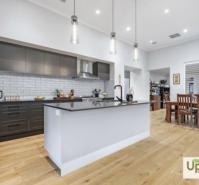 At the heart of the home lies a generous dining zone, adorned with soft sheer curtains and complemented by soaring 3.3-metre ceilings that extend through the living area, creating an airy and elegant ambiance. Anchored by a centrally positioned chef’s kitchen, this space is thoughtfully appointed with upgraded cabinetry, statement pendant lighting, and a generous walk-in pantry—effortlessly combining everyday functionality with timeless elegance, 900mm stainless steel free standing five burner cooktop & oven, a sleek dishwasher and expansive Caesar-stone benchtop that gracefully overlooks the outdoor entertaining area..