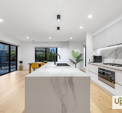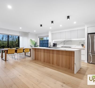 Designer Kitchen – 40mm porcelain waterfall island, book matched rear bench, and matching splash back, with upgraded cabinetry and modern feature lighting above the island.