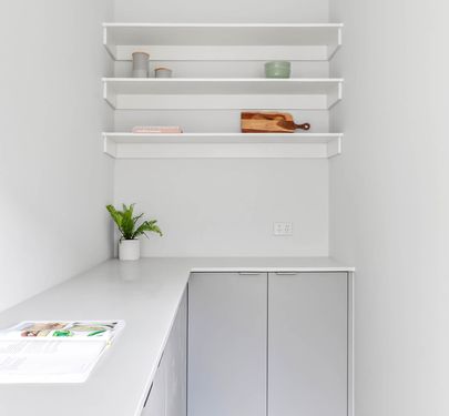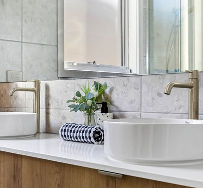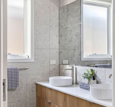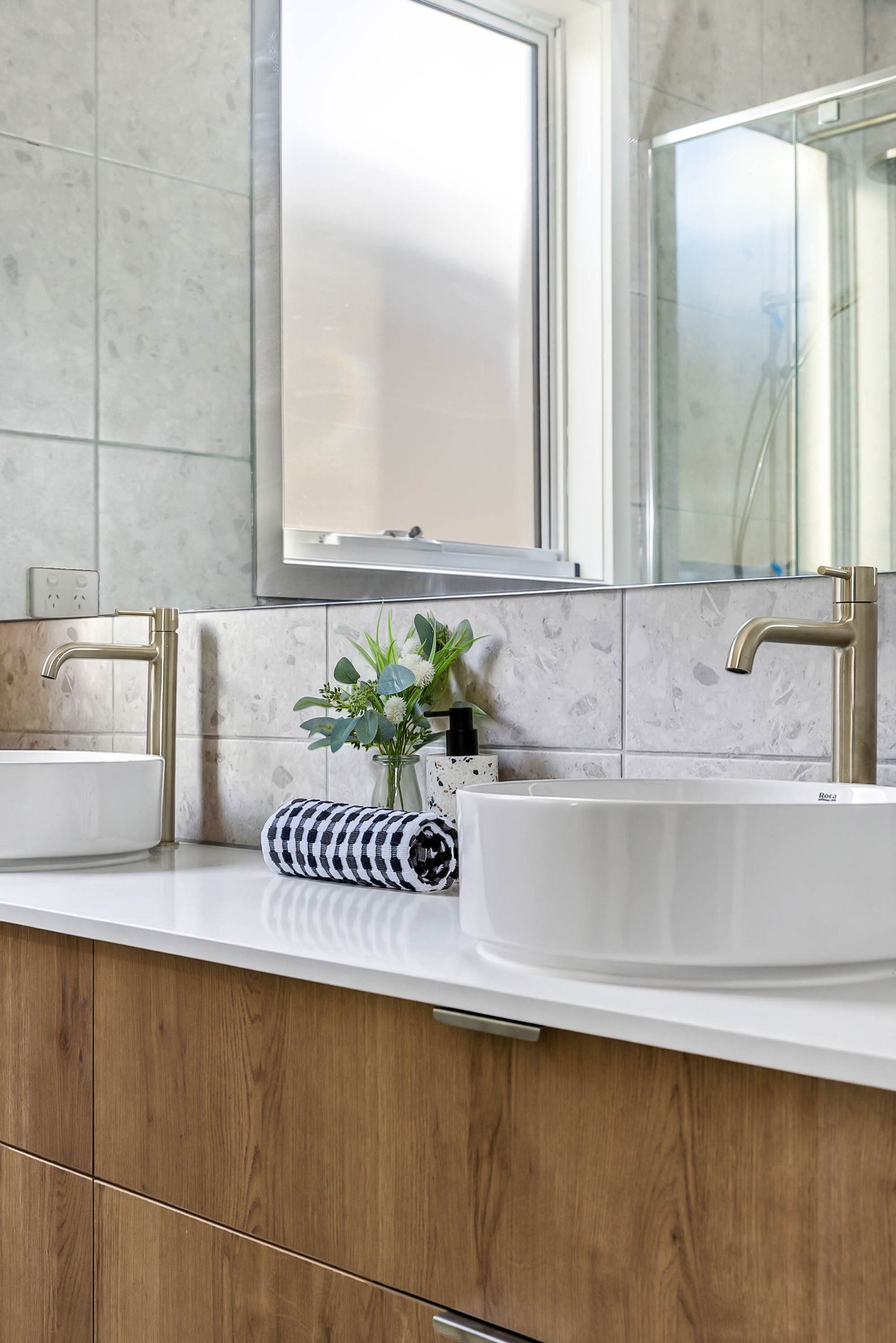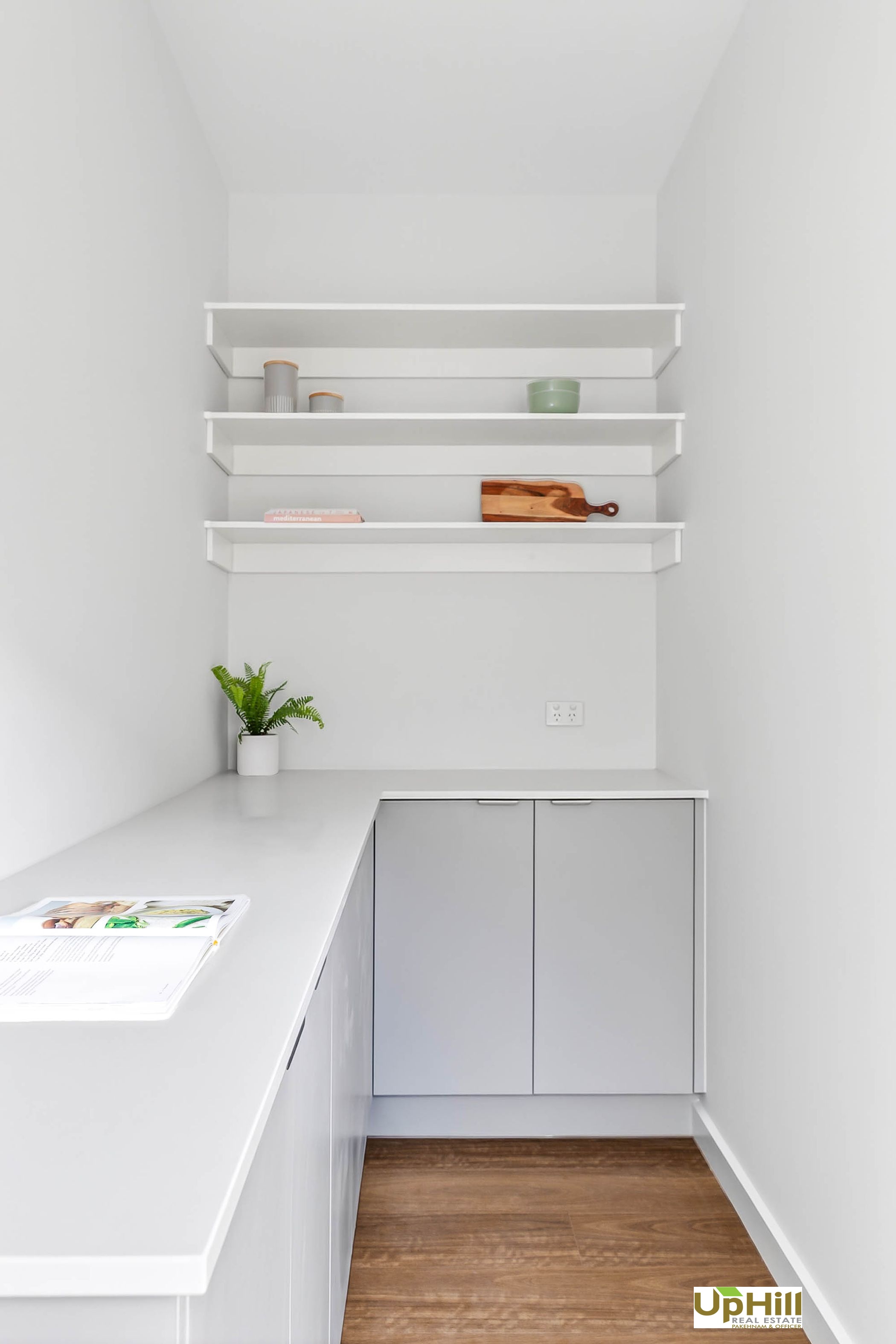 Includes dual access, built-in cabinetry, a stone benchtop, and a sleek undermount sink for modern practicality.