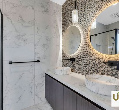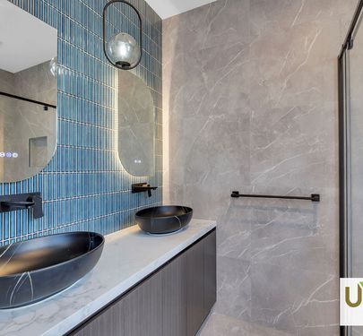 • Second Bedroom: Ensuite with floor-to-ceiling tiles, large shower, double vanity, and mirrored sliding wardrobe