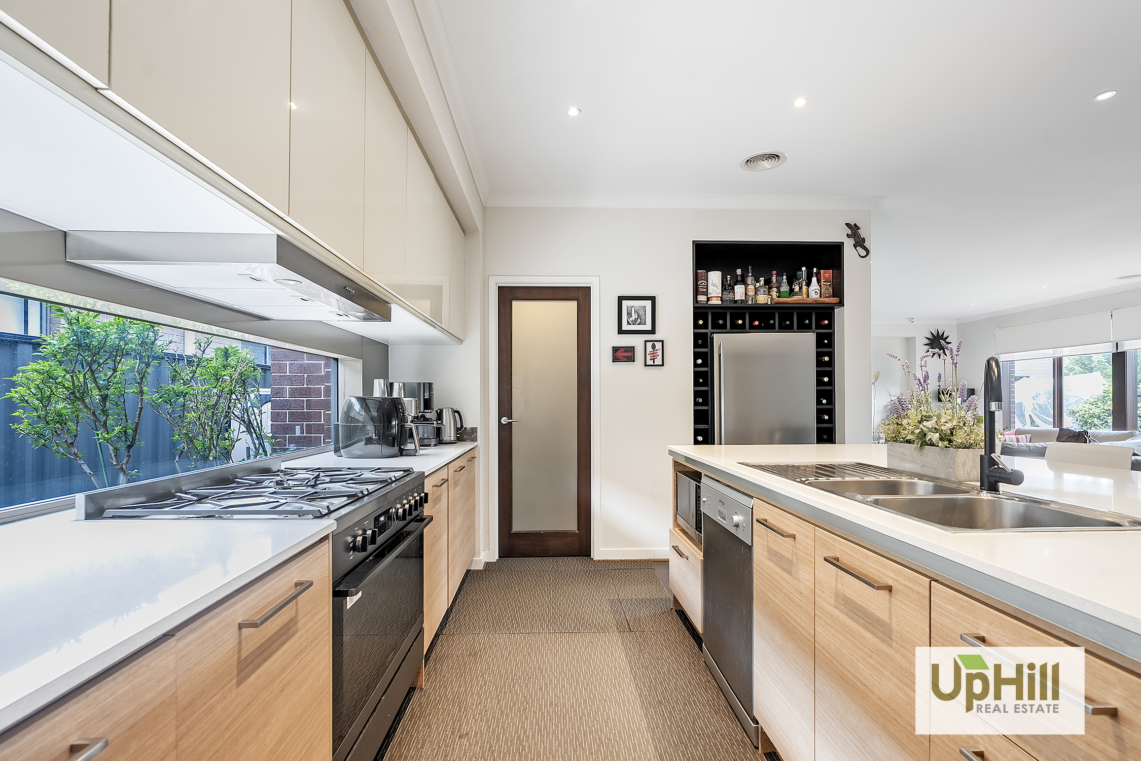 - Modern kitchen with built-in pantry, stainless steel appliances & island bench