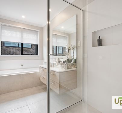 • Luxury Master Suite – Features a glass balcony, double-vanity ensuite with Phoenix tapware, tiled shower base, walk-in robe (WIR), and additional sliding-door storage.