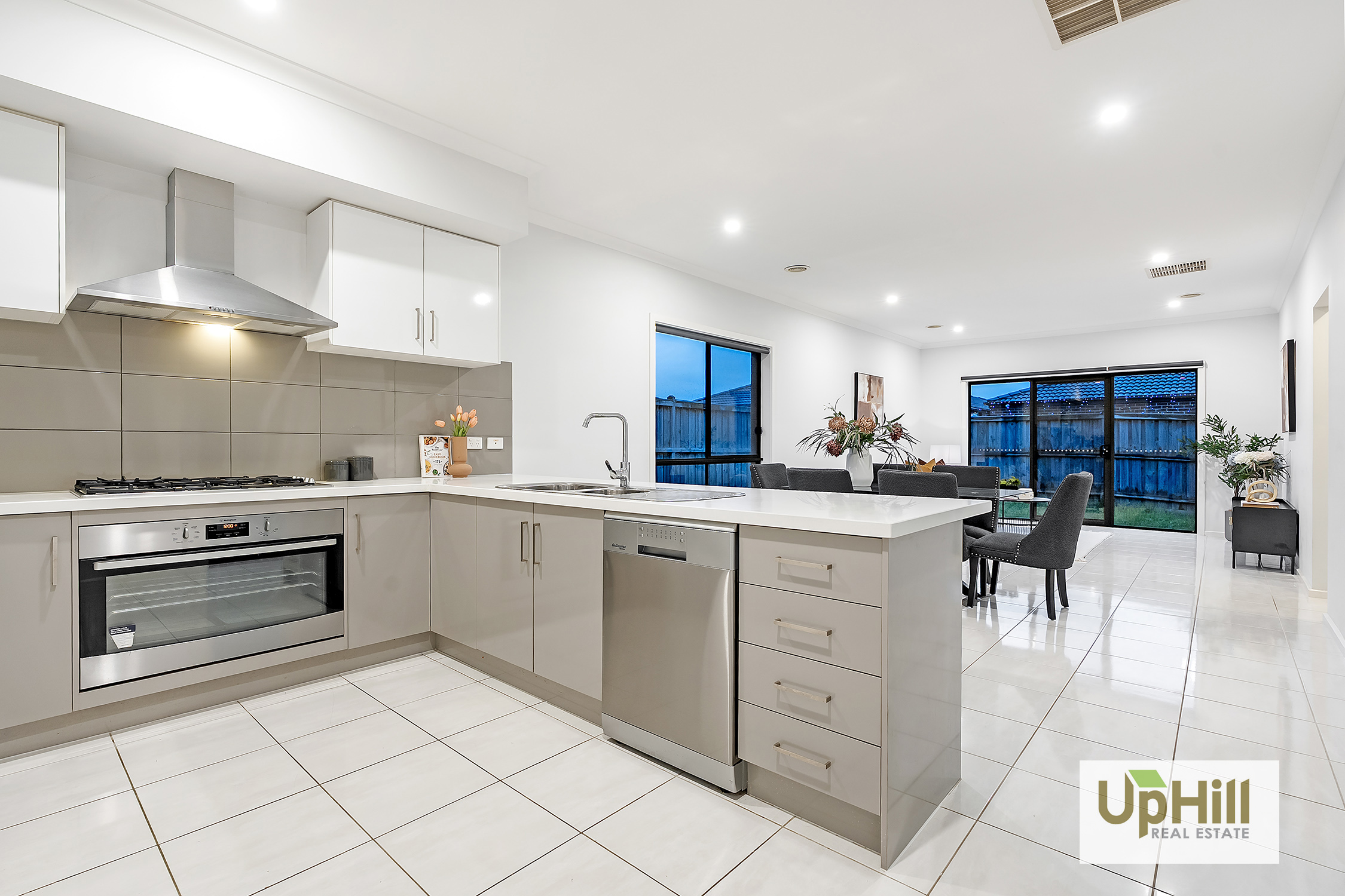 • Kitchen with 900mm 5-burner cooktop, 900mm oven, dishwasher, and stone benchtops.