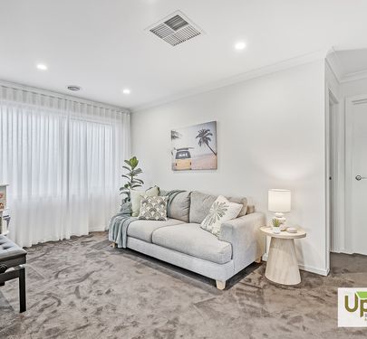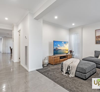 Step inside and be welcomed by a light-filled formal living area, enhanced with elegant sheer curtains. As you move further through the home, you’ll find a spacious open-plan dining and living zone, also upgraded with full sheer curtains, creating a warm and inviting atmosphere. Conveniently located nearby, the laundry features dual access and sits adjacent to a walk-in linen closet.