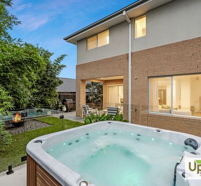 Step outside to the alfresco area, ideal for relaxing or hosting BBQs. The backyard is designed for year-round enjoyment, complete with a spa enclosed in a sleek glass frame. There’s also a dedicated space for a fireplace, making it perfect for cozy winter evenings.