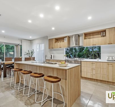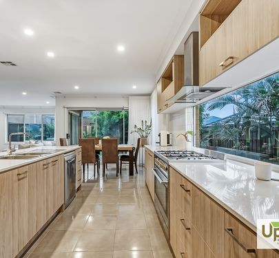 At the heart of the home lies a stunning modern kitchen, featuring a Caesarstone benchtop, upgraded cabinetry, and an additional walk-in pantry—perfect for those who love to cook and entertain.