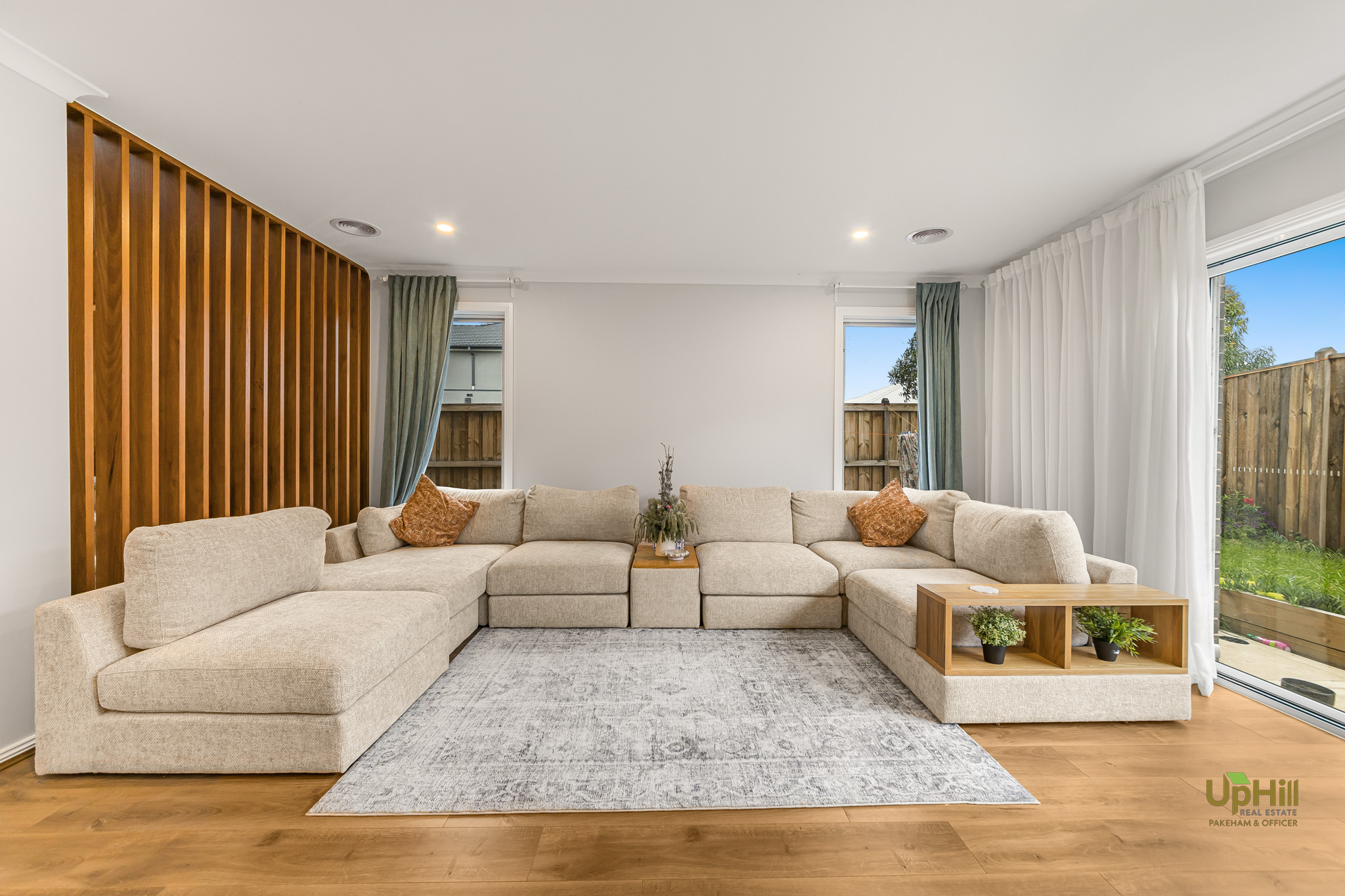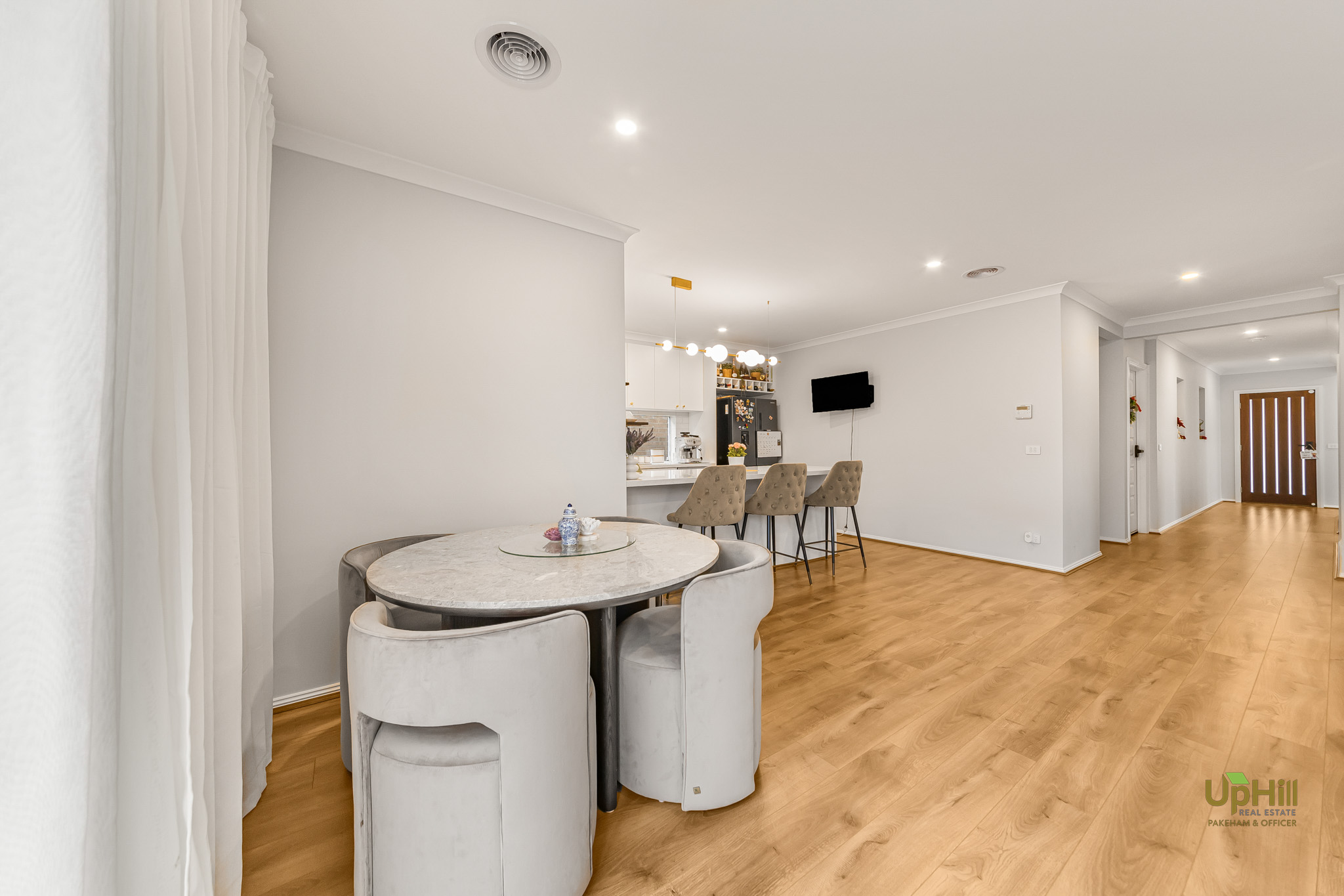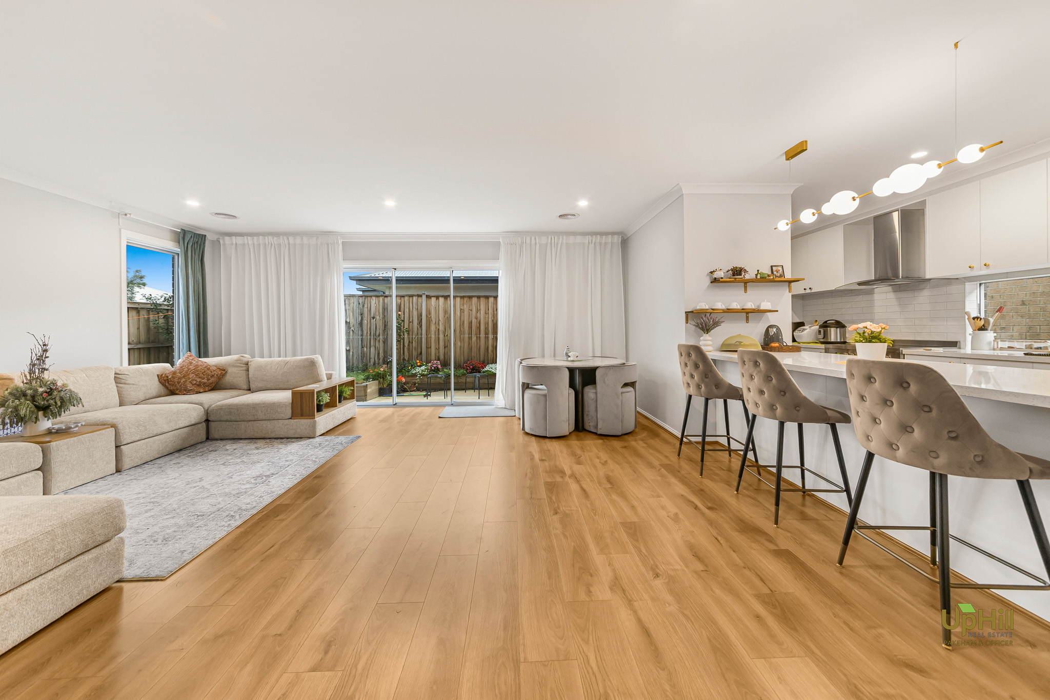 • Open plan living, dining, and kitchen area filled with natural light