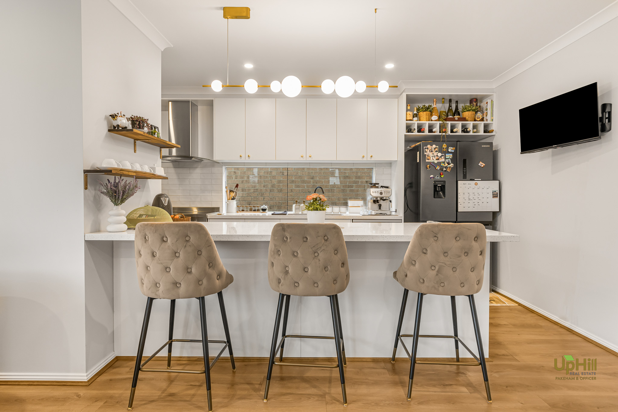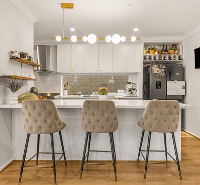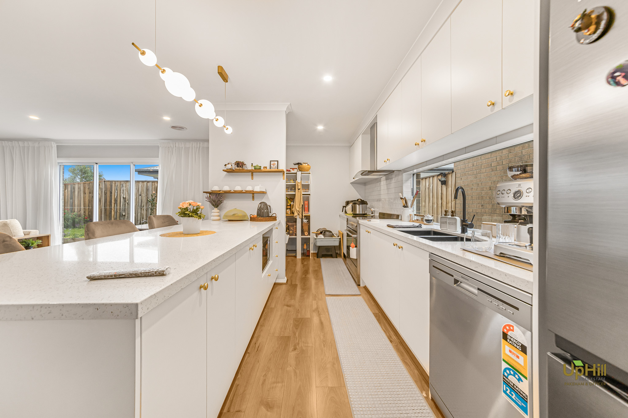 • Modern kitchen featuring stone benchtops, stainless steel appliances, walk-in pantry, and breakfast bar