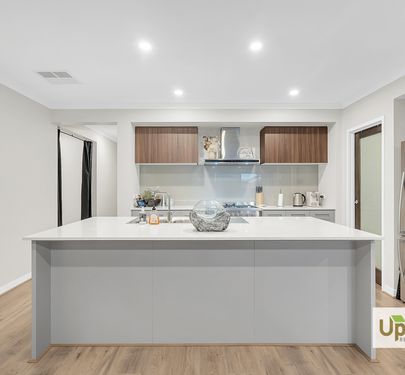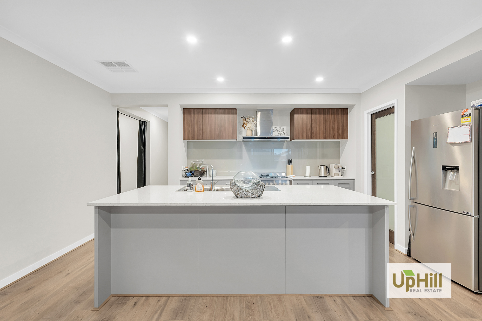 At the heart of the home is the open-plan living and dining space, complemented by a contemporary kitchen featuring quality cabinetry, a 900mm stainless steel freestanding five-burner cooktop and oven, and a large Caesarstone island bench designed for both practicality and style..